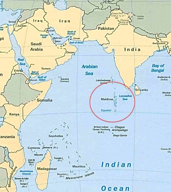 - تقع جمهورية المالديف في المحيط الهندي، جنوب غرب سريلانكا والهند